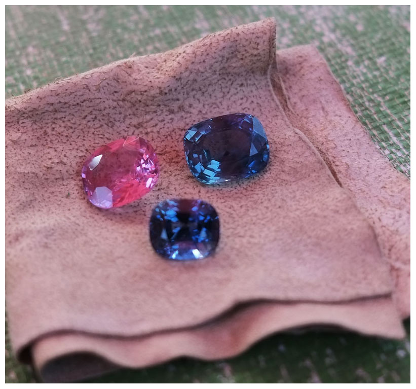 Un spinel rose et deux saphires au marché central de Mogok - Myanmar Birmanie